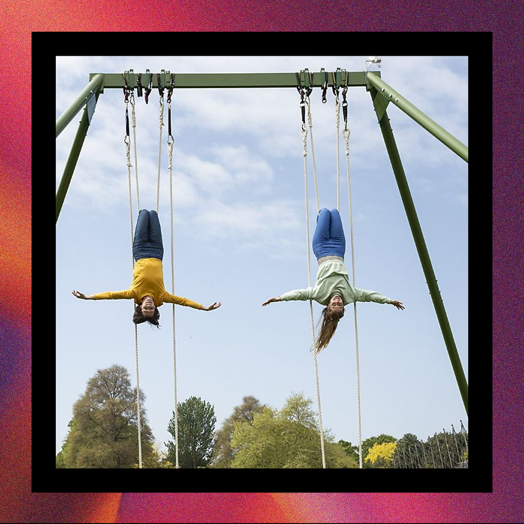 A giant swing set with soaring acrobats invites everyone to play, glide and feel wonderfully free.
