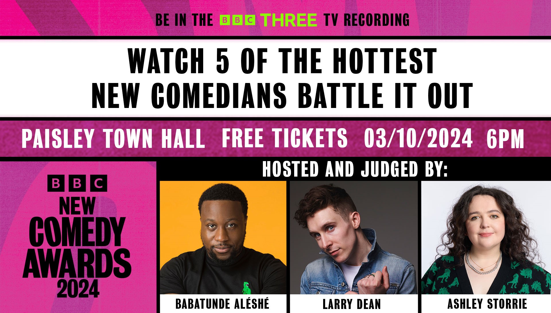 This Scottish final will be judged by writer and star of hit comedy Dinosaurs, Ashley Storrie and award-winning comedian and Gogglebox star, Babatunde Aleshe. Five cutting edge comics will battle it out for a place in the BBC One Grand Final.