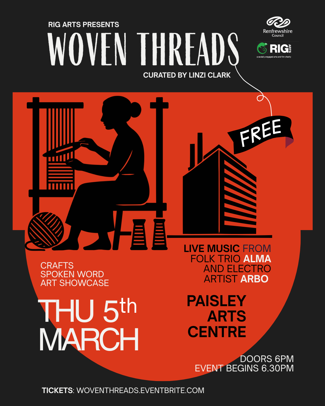 Woven Threads is a Free Arts events curated by Linzi Clark with Rig Arts. Expect live music, child friendly crafts and art exhibitions.